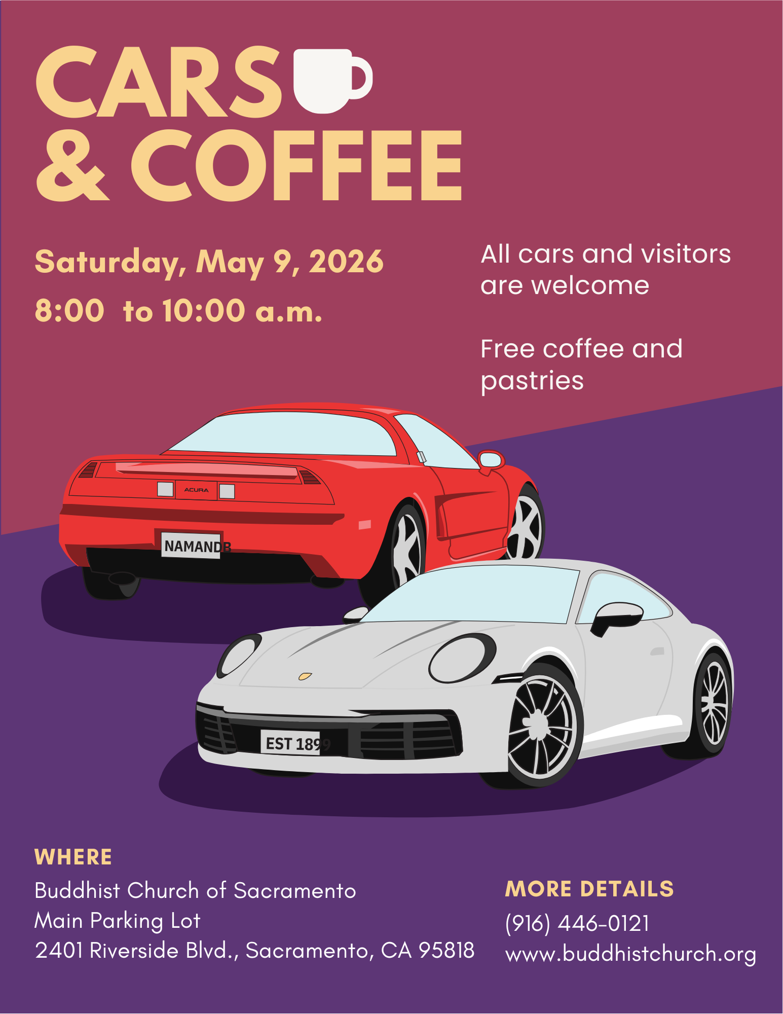 Join us on Saturday, May 9, 2026, from 8 to 10 a.m. at the Buddhist Church of Sacramento’s main parking lot, 2401 Riverside Blvd.