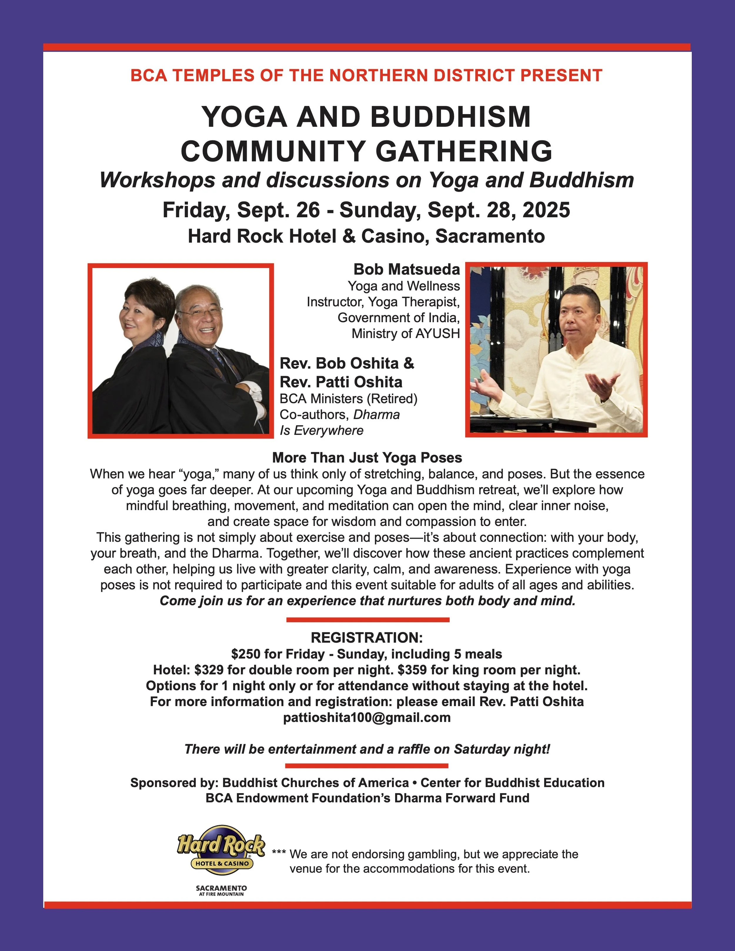 Come join this special multi-temple yoga and buddhism community gathering with Bob Matsueda, Rev. Bob Oshita, Emeritus, Rev. Patti Oshita, Rev. Yuki Sugahara, and Rev. Noritaka Imada.